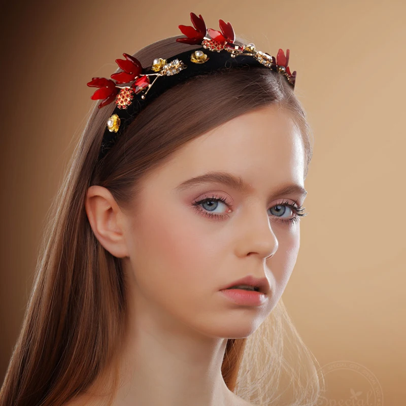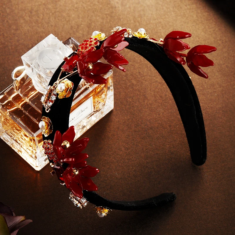2019 New Fashion Vintage Baroque Headband Crystal Red Flower Hairbands Women Pearl Metal Flower Hea